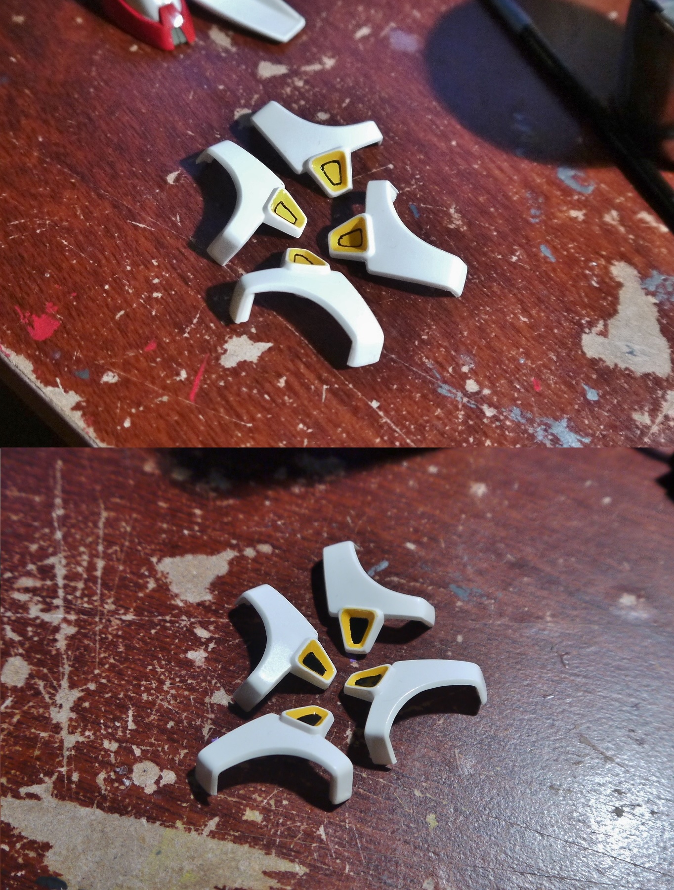 So about those black areas that should be filled into the yellow; the rather thick combination of acrylic brush paint and topcoat made the grooves and defining slopes of the plastic a bit hard to see, especially while brush painting. To counter messy painting (which has happened to me a lot in the past – I’d always try to do pieces like these and end up with them turning out really sloppy), I opted to use my panel-lining marker to outline the shape of the area I needed to paint first, then do the actual painting.