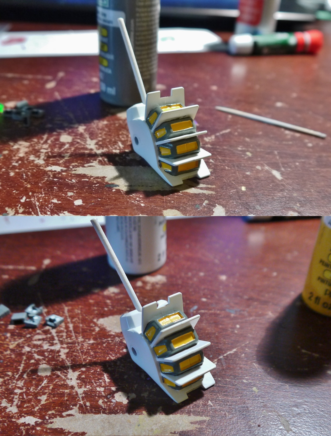 Tiny tiny yellow vulcans on the head were also painted, though the F91 doesn’t seem to sport any form of light-piping for its temples, so I’ll have to figure out a way to paint those in later.